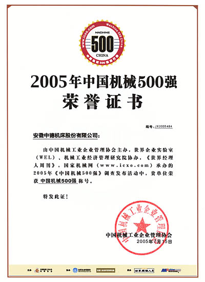 7月15日,2005年《中國機械500強》在北京人民大會堂隆重發(fā)布。其中一汽、上汽、中國兵器裝備集團公司等50家上榜企業(yè)同時入選2005《世界機械500大》。此次活動是由中國機械工業(yè)企業(yè)管理協(xié)會主辦,世界企業(yè)實驗室、機械工業(yè)經(jīng)濟管理研究院協(xié)辦,世界經(jīng)理人周刊和國家機械網(wǎng)聯(lián)合承辦的。此次評選中,金屬加工機械制造行業(yè)有19個企業(yè)入選;安徽省共有16個企業(yè)入選;馬鞍山市入選的有2家企業(yè)(除我公司外,還有星馬汽車股份有限公司進(jìn)入了500強企業(yè));在500強企業(yè)中我公司位列第484位。