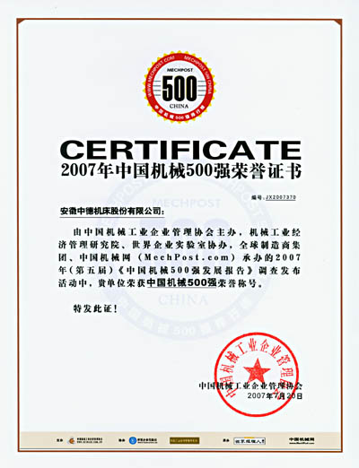 2007年《中國機(jī)械500強(qiáng)》暨《世界機(jī)械500強(qiáng)》發(fā)展報(bào)告會(huì)7月20在北京人民大會(huì)堂隆重舉行,我公司榮獲“中國機(jī)械500強(qiáng)”榮譽(yù)稱號(hào),位列第370位。
